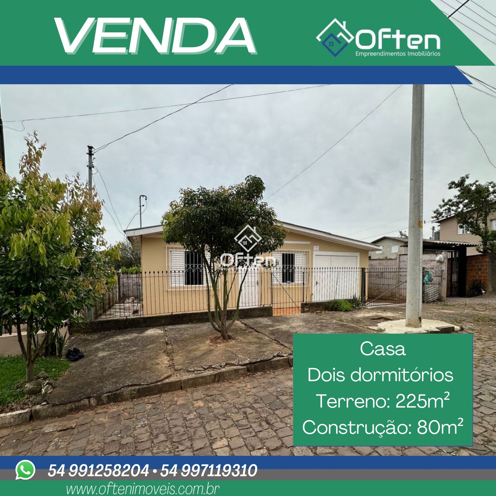 CASA A VENDA, com dois dormitórios, contando com um amplo terreno de 225m² e área de construção de 80m². Ideal para moradia familiar com o devido conforto.