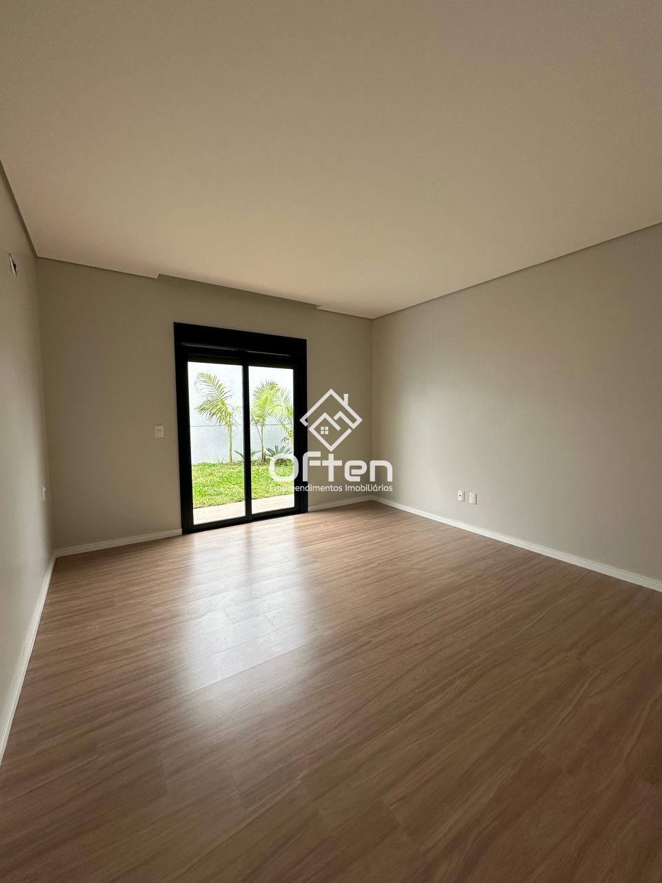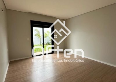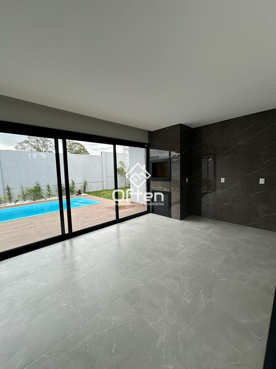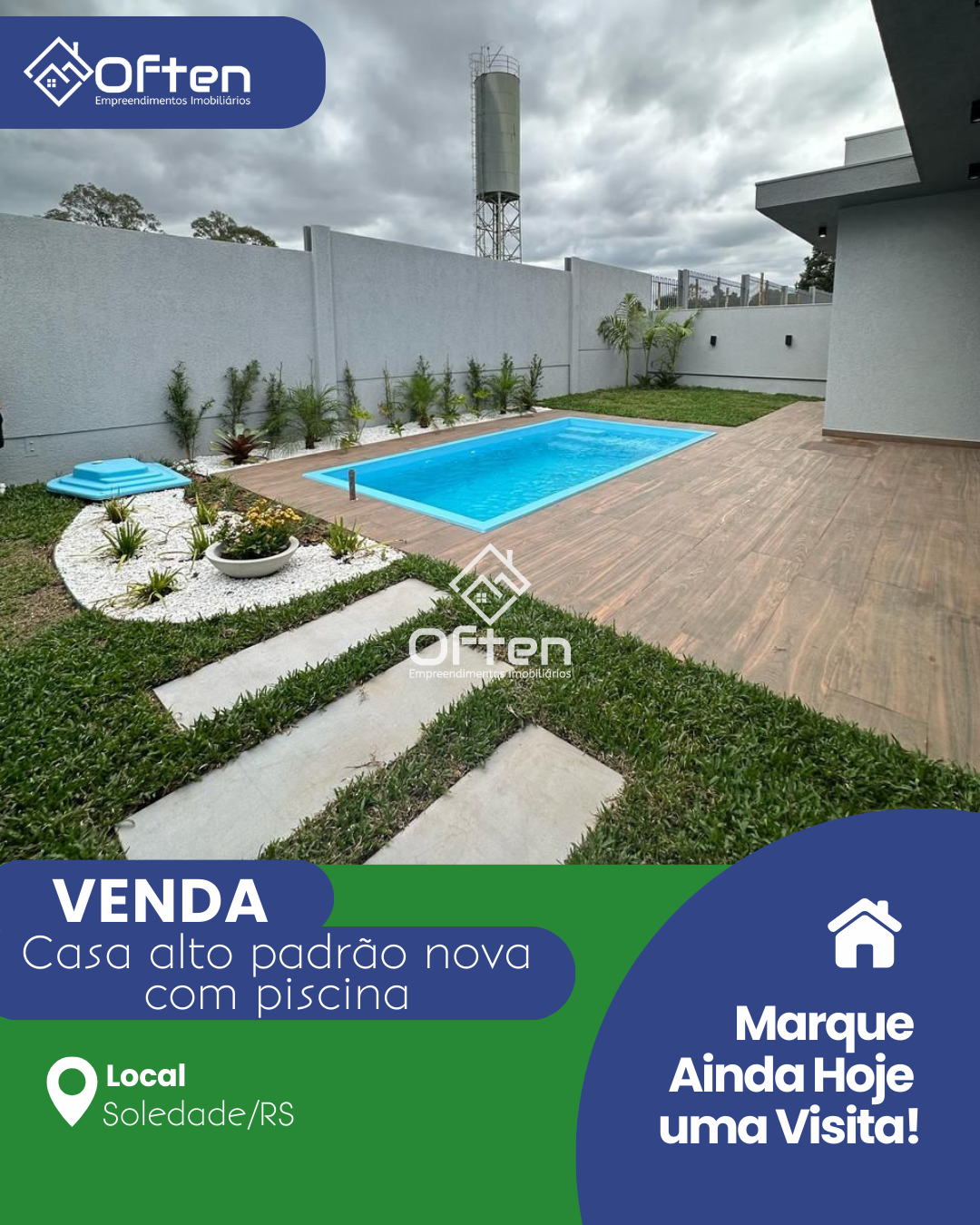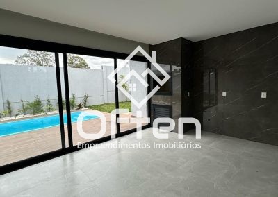 Possui três dormitórios, sendo um suíte, sala de estar, cozinha, banheiro, lavabo, área de serviço, garagem para dois veículos, espaço gourmet com churrasqueira e deck com piscina já instalada.